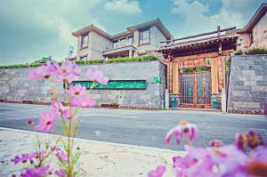 여산의 준령이 깊숙한 곳에 인면복숭아꽃이 담을 가득 비춘다.