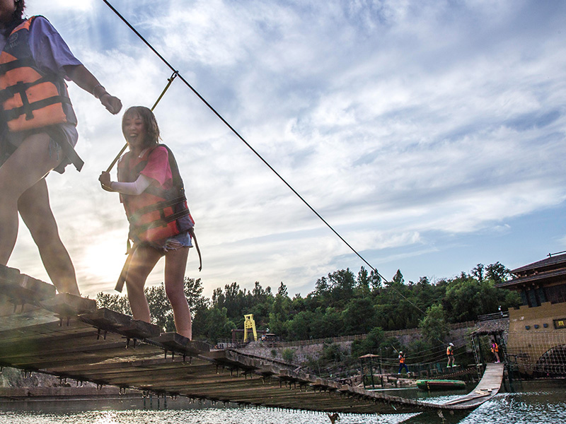 此项目是一项考验自我毅力与协调能力的项目,它能提升我们在面对压力时的及时调整能力,并增强我们的自信心。此项目是目前我省,乃至整个中原地区规模最大、技术性最强、专业最前卫的水上拓展基地,整个基地分别由:水上飞、天罗地网、蜘蛛侠、小板凳、软梯、平衡桥、缅甸桥、晃桥、高低桥、断桥、独木桥、荡木、大平衡等子项目组成,非常刺激和富有挑战意味,是磨练个人意志,挑战自我的快乐运动。为了更好的体验,每个项目最多容纳4人同时通过。一个凝聚力量的活动是一个好的团队不可缺少的经历,千人同心,则千人得力。在困难中创造机会,在竞争中铸就成功。