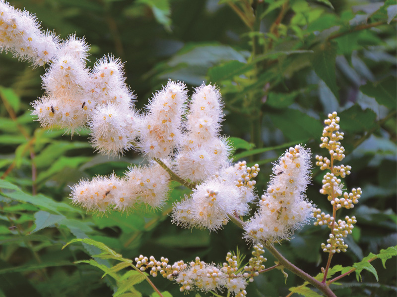 珍珠梅是蔷薇科,珍珠梅属灌木,高可达2米,枝条开展;冬芽卵形,紫褐色,先端圆钝,具有数枚互生外露的鳞片。羽状复叶,小叶片对生,披针形至卵状披针形,先端渐尖,稀尾尖,基部近圆形或宽楔形,稀偏斜,边缘有尖锐重锯齿,上下两面无毛或近于无毛,羽状网脉,托叶叶质,顶生大型密集圆锥花序,分枝近于直立,总花梗和花梗被星状毛或短柔毛,果期逐渐脱落,苞片卵状披针形至线状披针形,先端长渐尖,全缘或有浅齿,上下两面微被柔毛,果期逐渐脱落;尊筒钟状,尊片三角卵形,先端钝或急尖,尊片约与尊筒等长;花瓣长圆形或倒卵形,白色;雄蕊生在花盘边缘;心皮无毛或稍具柔毛。菁蓉果长圆形,有顶生弯曲花柱,7-8月开花,9月结果。